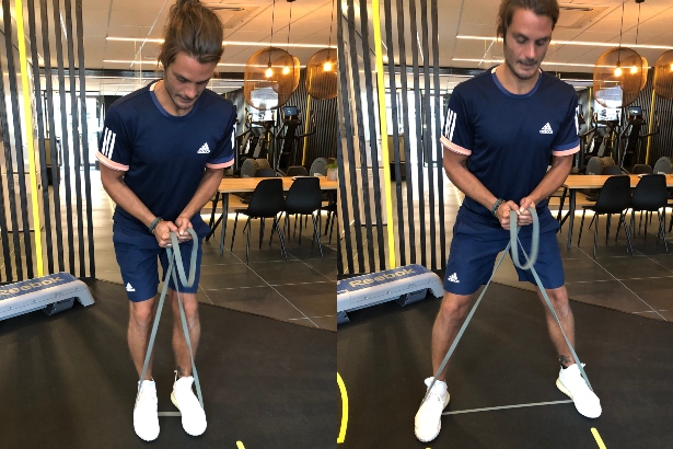 De resistance band side lunge, hier uitgevoerd met een groot elastiek, is ook uit te voeren met een klein elastiek net boven de knieën.