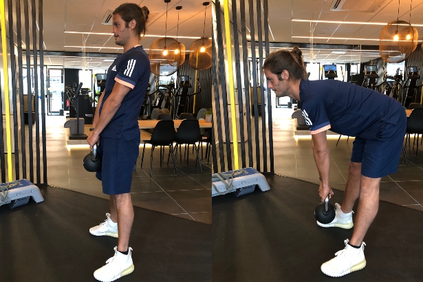 - Houd de kettlebell met gestrekte armen vast en beweeg je heup naar achter.