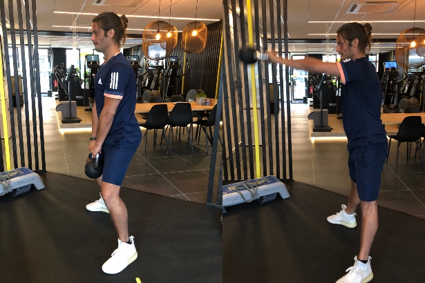 - Zwaai de kettlebell door je benen naar achter strek je heup vervolgens uit en zwaai de kettlebell naar voren tot schouderhoogte.