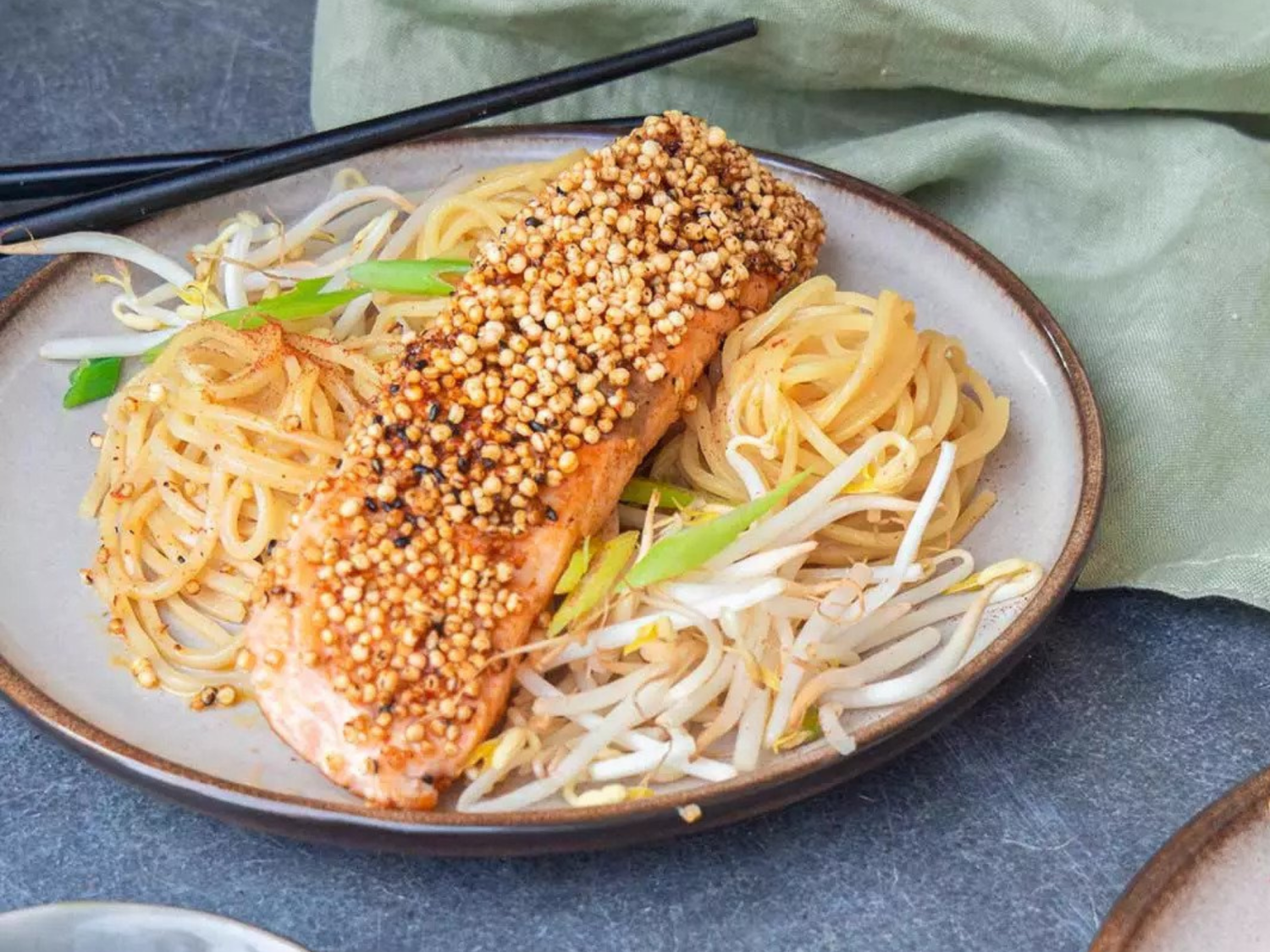 Serveer de zalm met een handjevol noedels of rijst.